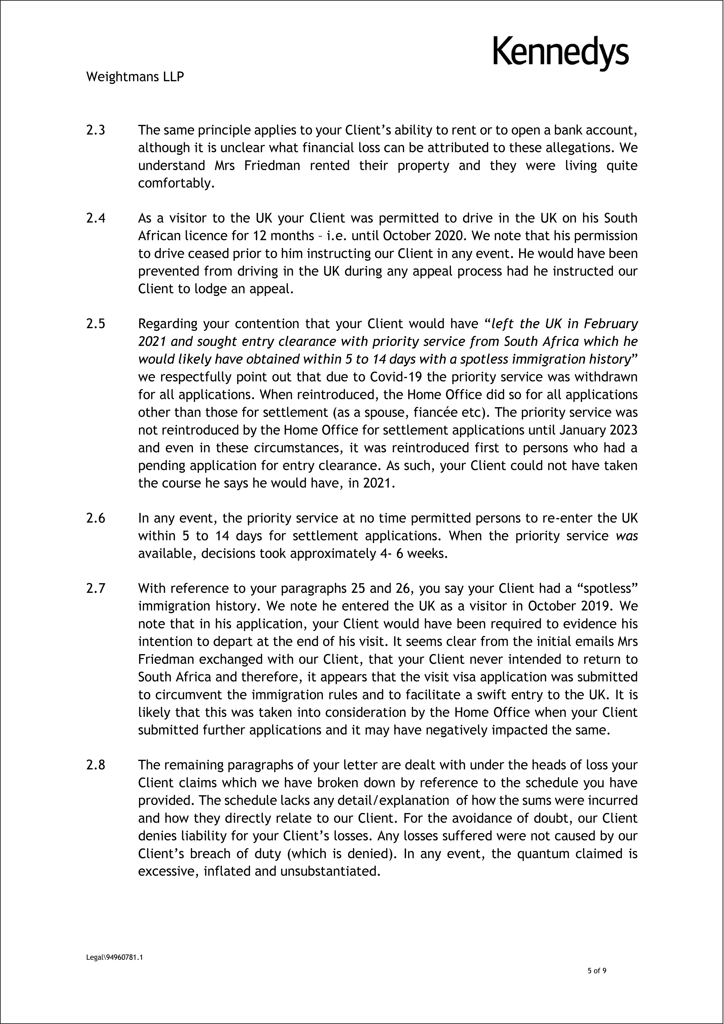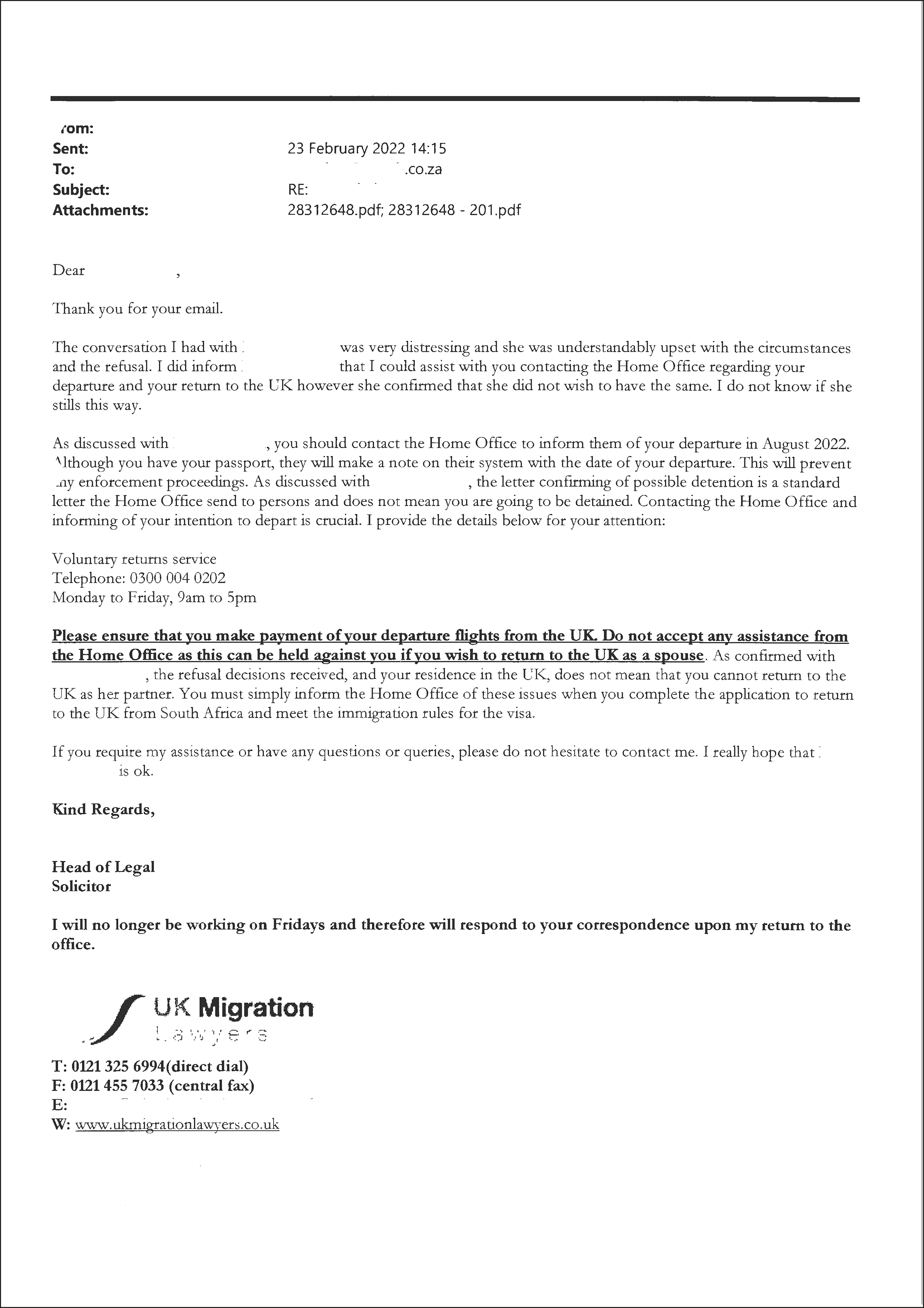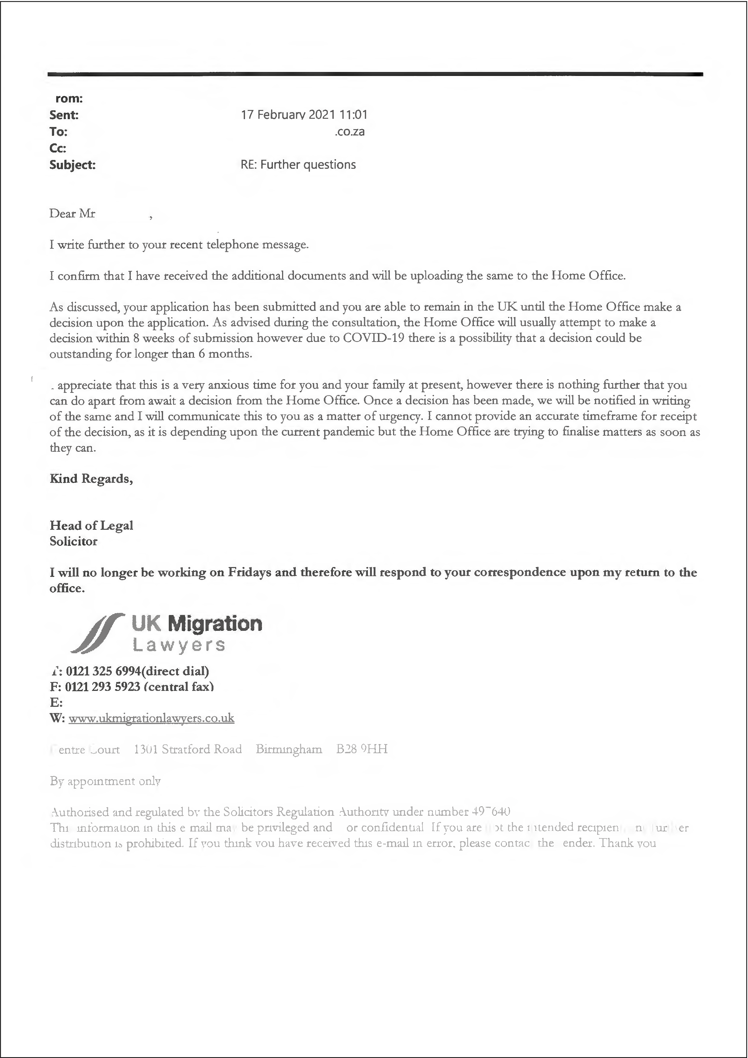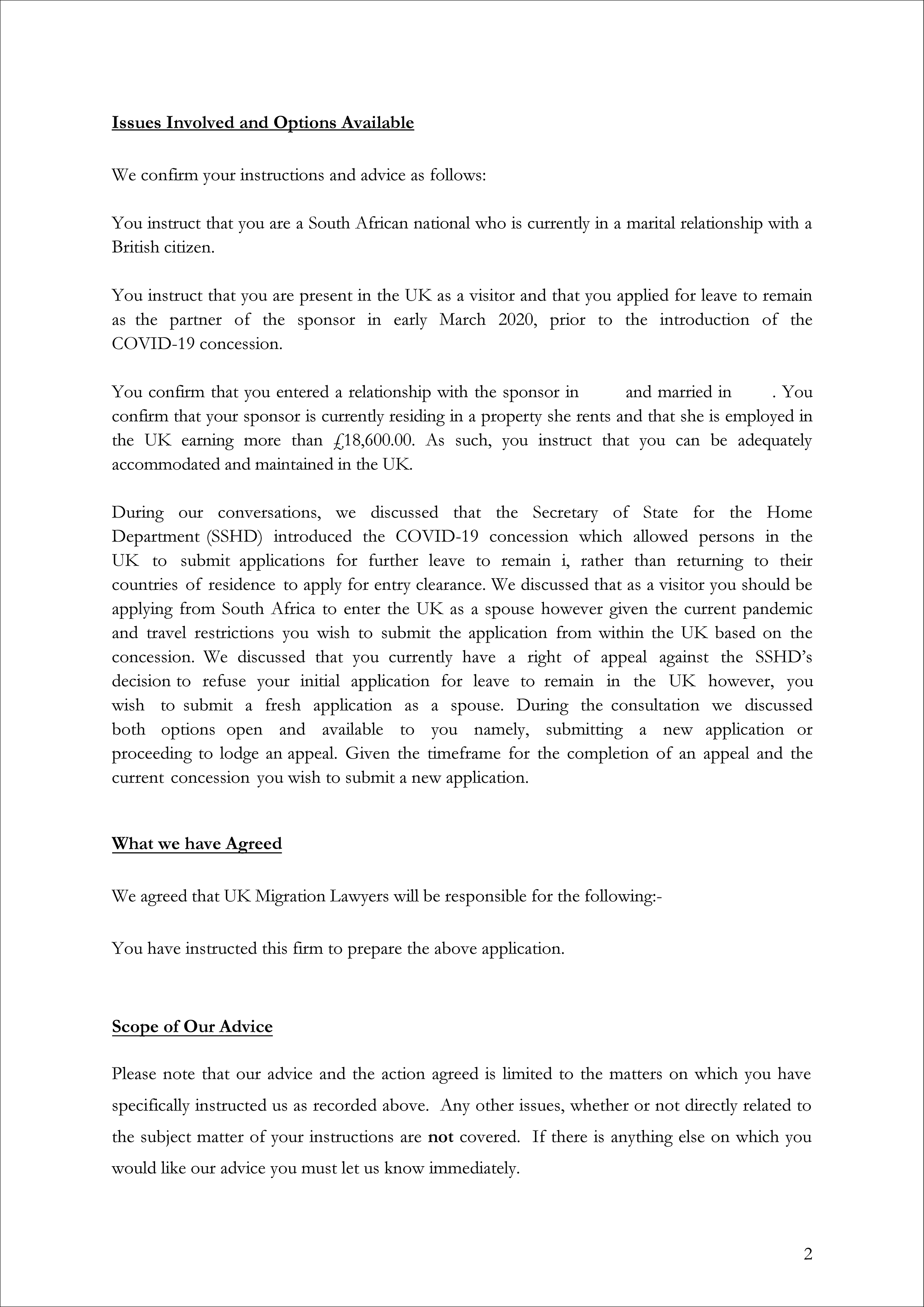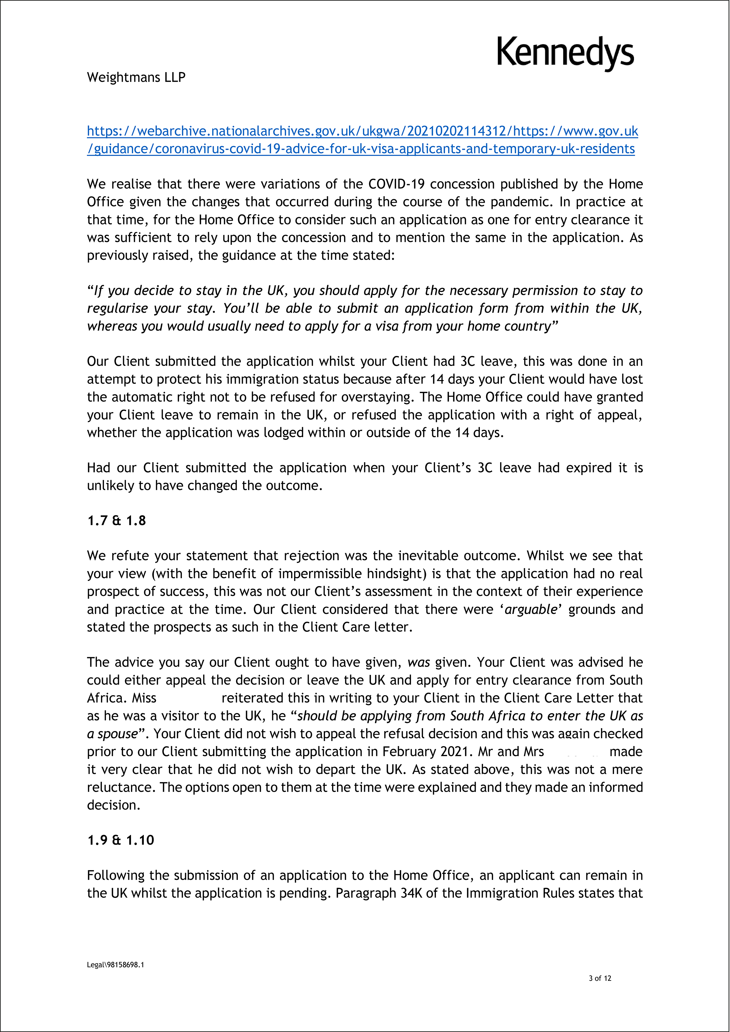 “With reference to your paragraphs 25 and 26, you say your Client had a “spotless” immigration history. We note he entered the UK as a visitor in October 2019. We note that in his application, your Client would have been required to evidence his intention to depart at the end of his visit. It seems clear from the initial emails Mrs xxx exchanged with our Client, that your Client never intended to return to South Africa and therefore, it appears that the visit visa application was submitted to circumvent the immigration rules and to facilitate a swift entry to the UK. It is likely that this was taken into consideration by the Home Office when your Client submitted further applications and it may have negatively impacted the same.”