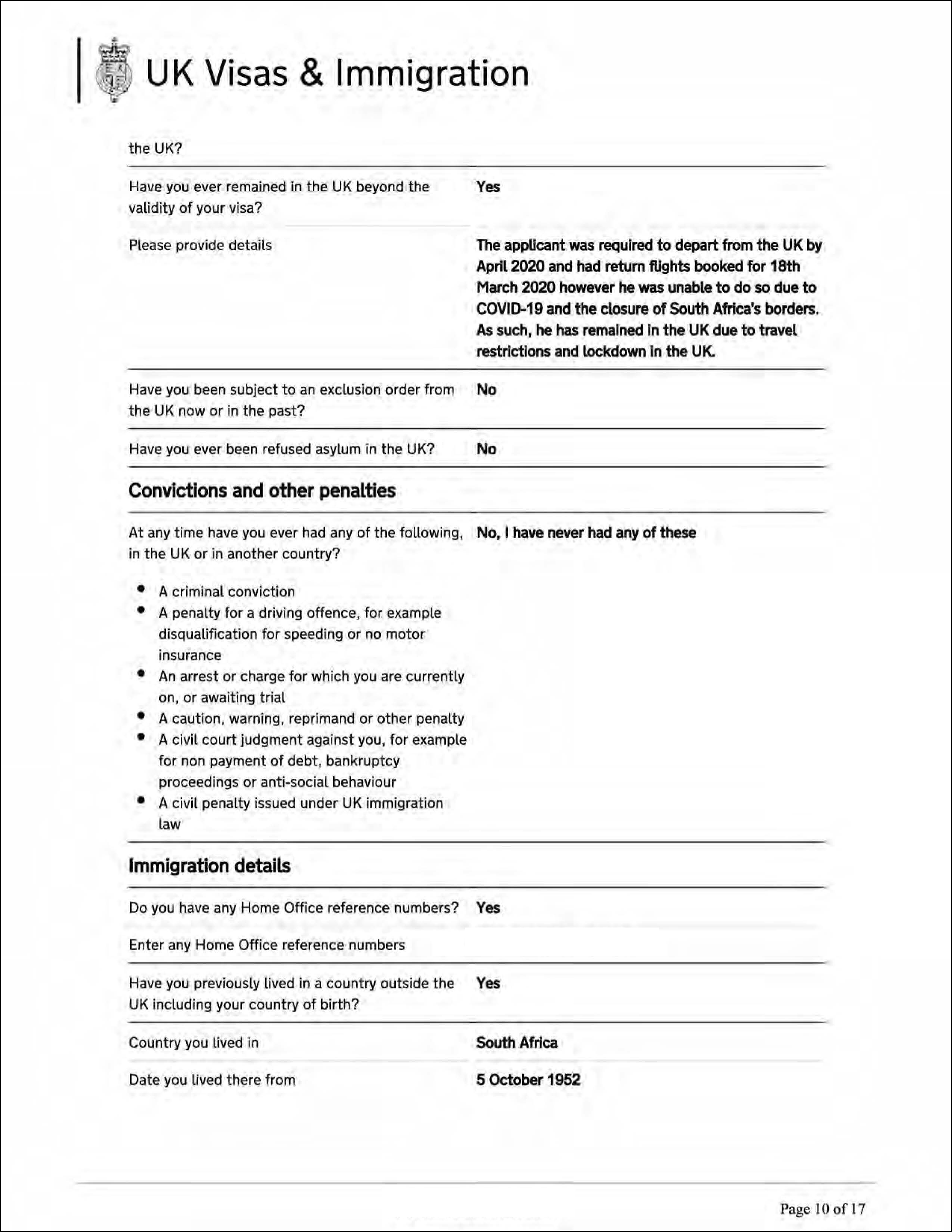 The overstaying began on 9 February 2021 after UK Migration Lawyers’ immigration solicitor submitted a ‘fresh application’ for leave to remain during Section 3C leave without requesting exceptional assurance.