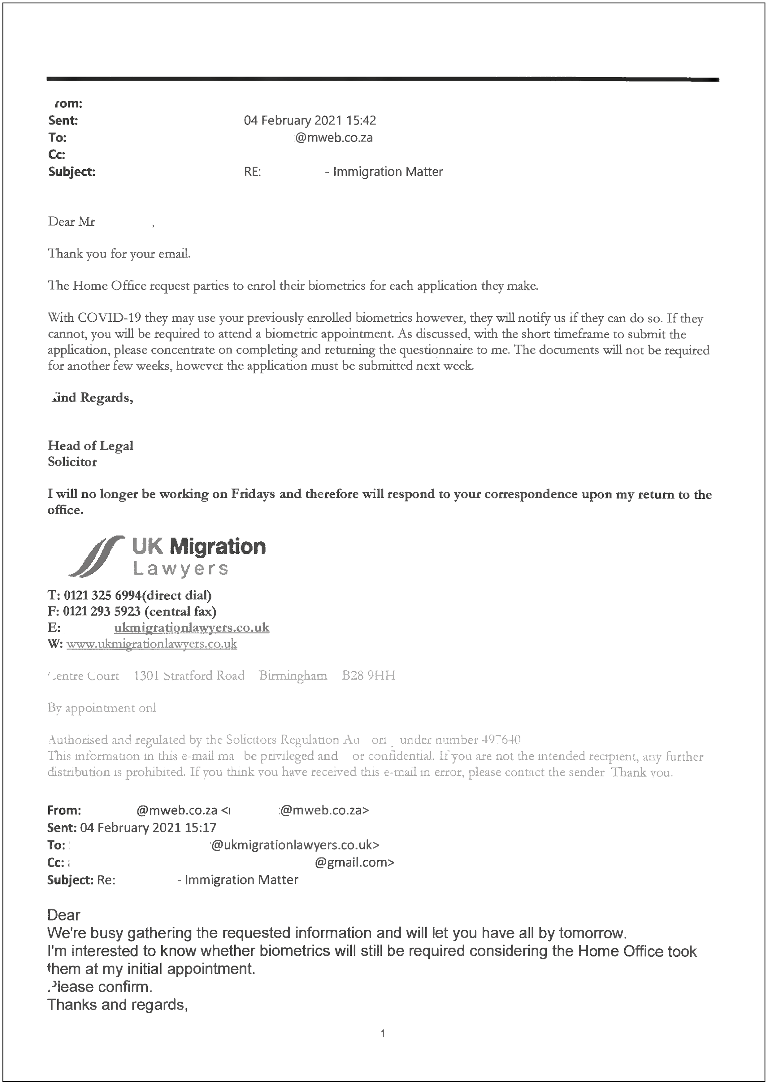 ”As you ought to be aware, the date of an application is not necessarily the date the SSHD will begin to review the supporting documents. It is only after the biometrics have been enrolled that the SSHD begin the review. We refute your claim that the Home Office requires all supporting documentation at that time. Any documentation provided to the Home Office following enrolment of biometrics, is considered by them up to the date of a decision being made.”